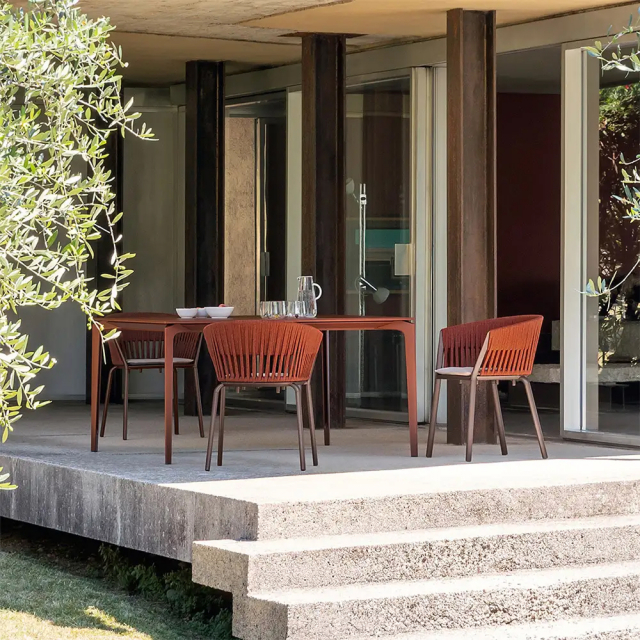 Borden kombinerar rena, geometriska former med en mix av hållbara material. Välj mellan olika bordsskivor som vilar på ett stabilt underrede i lackerad aluminium – en snygg kontrast som ger bordet både karaktär och styrka. Ben, ram och stöd är tillverkade i strängpressad aluminium, vilket gör bordet både lättskött och långlivat.