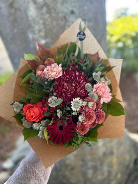 Härlig bukett i varma toner bunden med säsongens blommor.