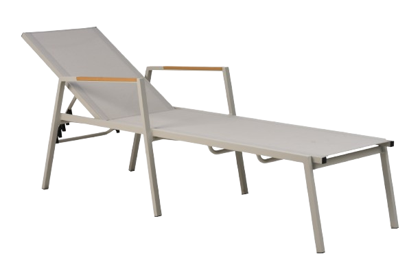 Cap vilsäng kombinerar modern design med naturlig värme. Den lätta men stabila aluminiumstommen ger ett stilrent och samtida uttryck samtidigt som den är motståndskraftig mot väder och vind. Vilsängen med textilén och armstöden i teak som tillför en exklusiv känsla och ger en behaglig kontrast till metallen, både visuellt och ergonomiskt.