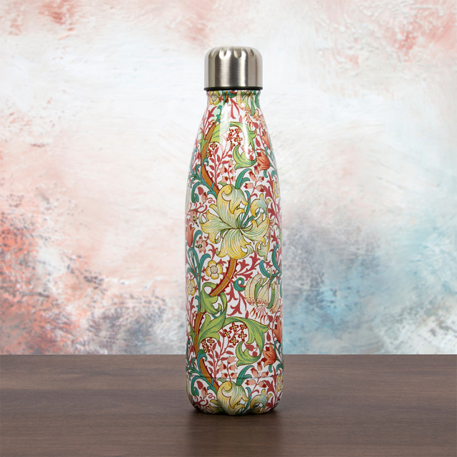 En vattenflaska i metall som rymmer ca 75 cl med William Morris mönster Golden Lily.