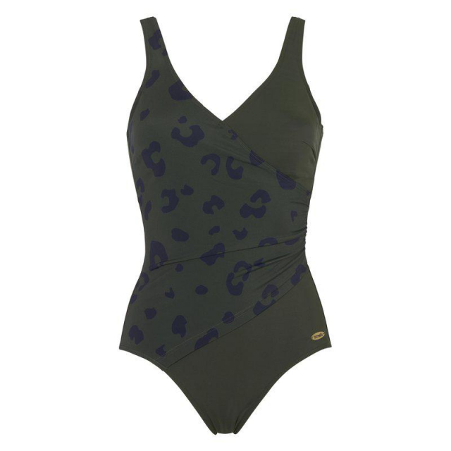 Julia är en elegant baddräkt som kombinerar stil och komfort i en smickrande design. Den omlottformade draperingen framtill skapar en feminin siluett som framhäver midjan och ger en vacker form. Tyget med ett diskret leopardmönster ger ett modernt och exklusivt uttryck, medan den enfärgade basen ger ett lugnt och sofistikerat intryck.