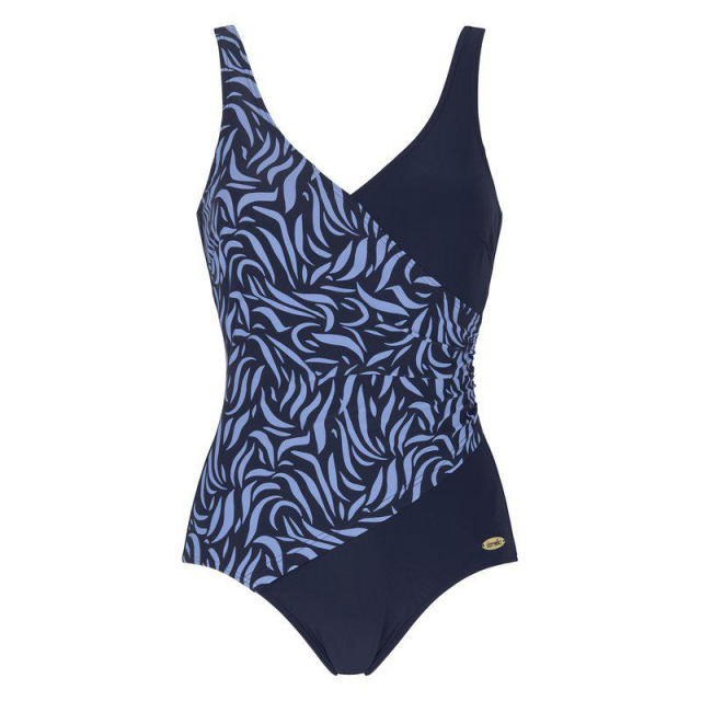 Den draperade omlotteffekten framtill tillsammans med det kontrasterande tyget skapar en smakfull siluett som framhäver figuren på ett naturligt sätt. Det mönstrade partiet möter det enfärgade tyget i en modern design som känns både klassisk och trendig. Dessutom har baddräkten reglerbara axelband så att du enkelt kan anpassa passformen efter dina behov.