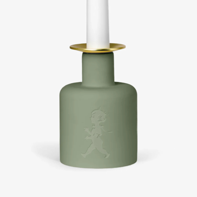 Stilren ljusstake i keramik som kombinerar form och funktion. Med den medföljande ljusmanschetten i guld skyddas underlaget från stearin. Ljusstaken blir en vacker inredningsdetalj för både vardag och festdukning.
