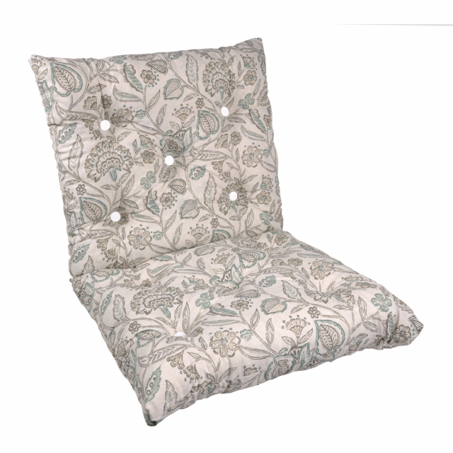 Tillverkad i en slitstark och lättskött bomulls- och polyesterblandning med mjuk flockstoppning för god komfort. De dekorativa knapparna håller fyllningen på plats och ger bra stöd för både rygg och sits. En lätt och smidig dyna som passar perfekt för sommarens alla stunder utomhus.
