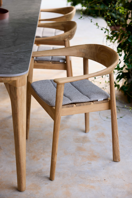 De diskreta kardborrebanden på undersidan gör det enkelt att fästa dynan under sitsen så att den håller sig på plats. Dynan balanserar tidlös design och funktionalitet. Den är tillverkad i Cane-lines slitstarka och väderbeständiga textiltyper, vilket säkerställer både komfort och ett inbjudande uttryck säsong efter säsong – en genomarbetad finish till en stol som förenar estetik och komfort.