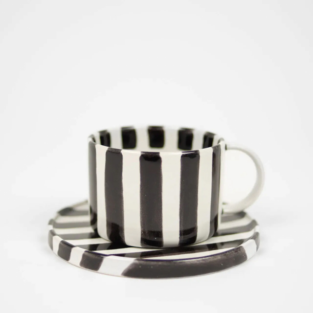 Monica är en handmålad kopp med ett glatt uttryck och ett tillhörande fat. Den finns i flera härliga färger som är fina att kombinera.