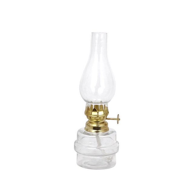 Mindre fotogenlampa i klarglas med brännarerör i klarglas och brännare i mässing. Inklusive en veke.