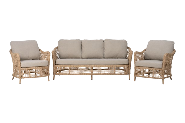 Den beige konstrottingen ger ett naturligt och harmoniskt intryck som smälter fint in i både moderna och klassiska miljöer. Materialet är tåligt och väderbeständigt, vilket gör möblerna väl anpassade för nordiskt klimat. De mjuka, beige dynorna skapar en ombonad känsla och erbjuder hög komfort – idealiskt för långa sommarkvällar på altanen, uteplatsen eller i trädgården.
