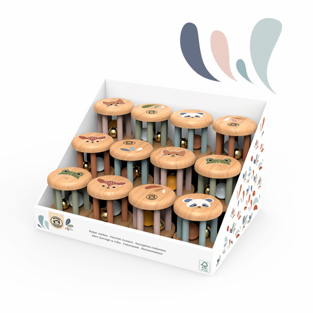 Charmiga träskallror som rullar fram över golvet med ett härligt skramlande ljud som väcker barnets nyfikenhet. Sidorna är dekorerade med olika djur. Skallrorna är perfekt utformad för små händer att greppa och utforska samtidigt som hand-öga-koordinationen utvecklas.