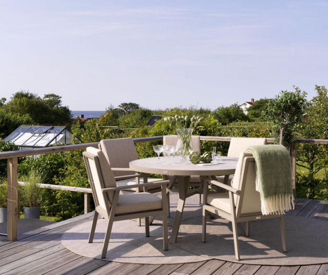 Samvaro är en serie i aluminium med en modern stil och fina detaljer som ger en inbjudande känsla. Runt matbord med 3-D tryckt glasskiva och karmstolar med tjocka dynor i olefintyg med en vattenavvisande beläggning med extra formad ryggdyna är det en matgrupp att sitta länge i.