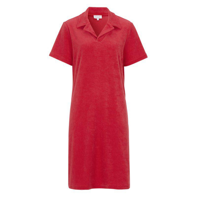 Stilren och bekväm strandklänning i mjuk stretchfrotté i en härlig röd färg. Designad med krage, korta ärmar och praktiska fickor för en avslappnad men elegant look. Perfekt att slänga på sig över badkläderna för en dag vid stranden eller poolen!